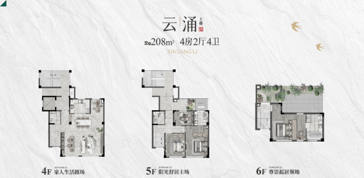 上叠:208㎡(4房2厅4卫),赠送5-6层露台约40-50㎡,总价530-580万元