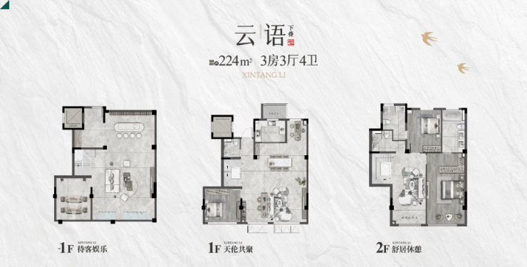 下叠:224-363㎡(3房3厅4卫),赠送15-30㎡花园+50-140㎡挑高地下室,总价600-650万元