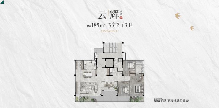 平层:185㎡(3房2厅3卫),赠送南向18米露台约30㎡,总价420-460万元