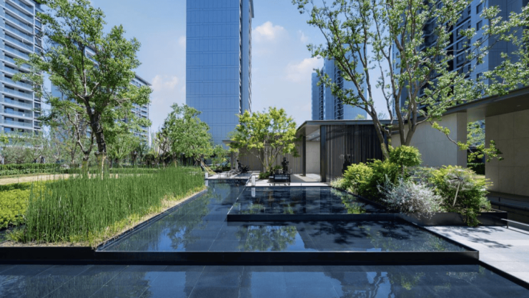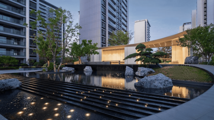 业主们穿过落瀑水景的高定礼仪,步入雅致的复合水苑客厅,在户外艺术慢空间、漂浮环水会客厅小憩,宛若徜徉山水之间。