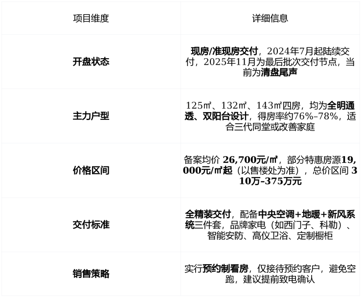 在售状态现房清盘中 ,主力户型125–143㎡四房,备案均价 26,700元/㎡ ,特惠房源 19,000元/㎡起 ,总价约 310万–375万 ,剩余房源有限。