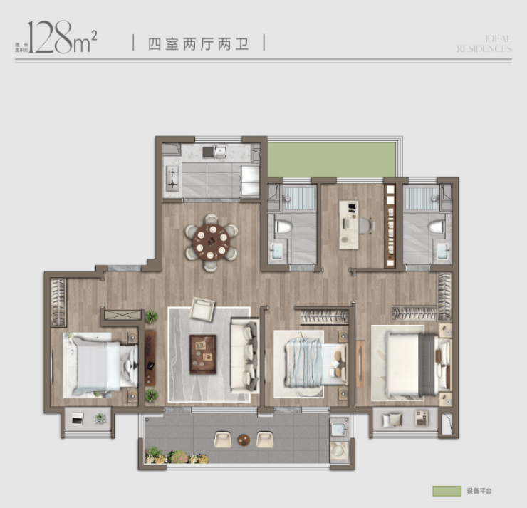 约128㎡宽境四房,南向四开间大面宽,阳光清风自在畅行;目之所及皆是风光如画;舒阔主卧套房,南向大飘窗,悦享精致人生;朗阔四房设计,满足三代同堂或二胎时代的全周期生活所需,幸福一步到位。