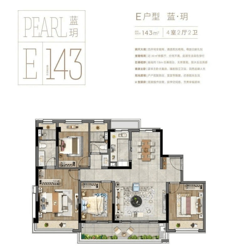 143㎡四居:12#楼17层1梯1户,精装交付总价235-250万,层高3.1米,配备独立衣帽间
