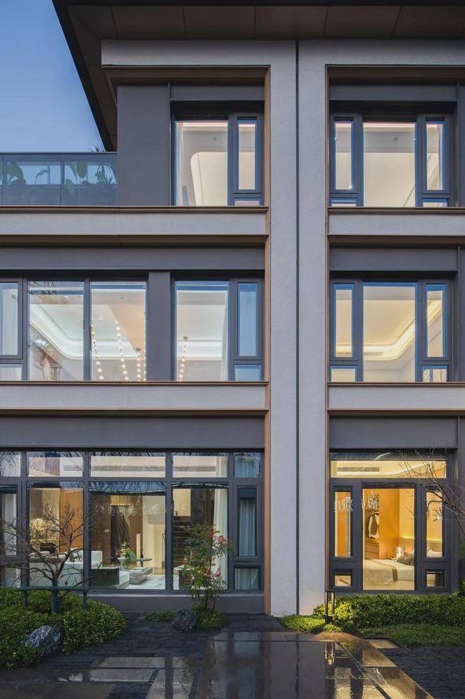 楼间距超40米,外立面采用灰色铝板+浅灰石材,融合新加坡园林水系