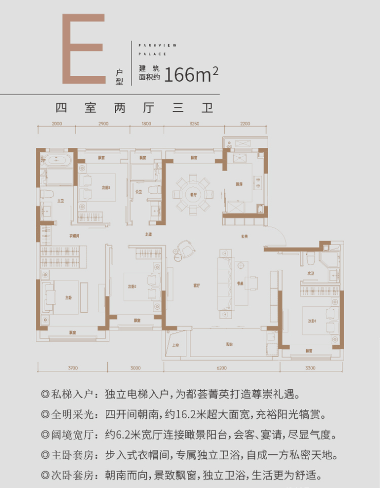 核心亮点:得房率高达80%–83%,166㎡户型实得面积超133㎡,比同区项目多出8㎡实用空间,全明户型、大面宽阳台、LDK一体化设计;
