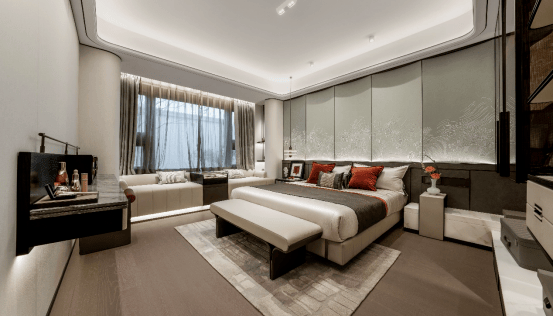 餐客厅一体化设计,让室内享有更充沛的采光的同时,极大地延伸了整个空间的边界和景观视野。主卧套房采用观景飘窗设计,扩大了室内的采光视野,更大大地增加了空间使用率和通透性。独立卫生间、衣帽间等设计,让整个空间享受星级酒店般私密尊荣。