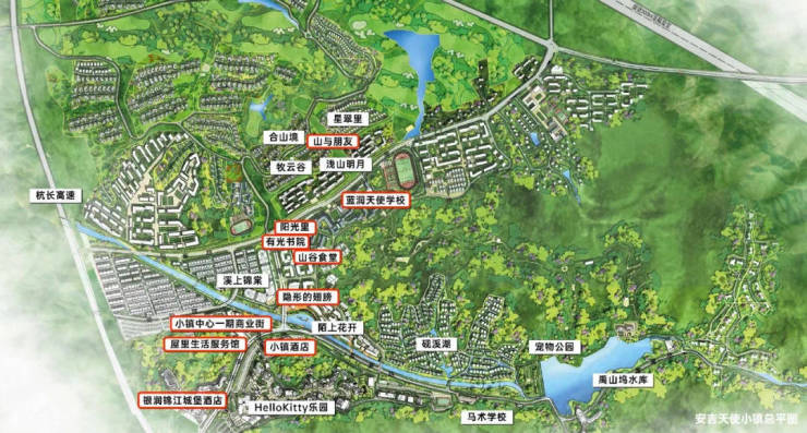 项目位于安吉县天禹路,毗邻Hello Kitty乐园,是天使小镇1200亩中心场域的核心产品之一