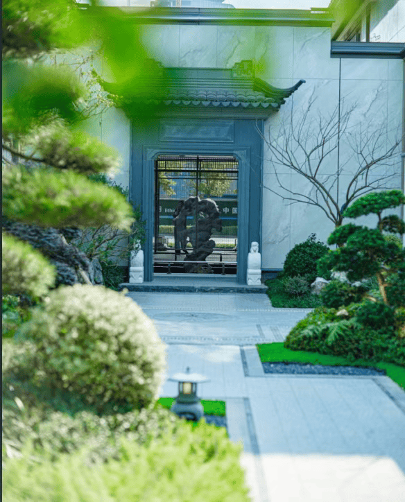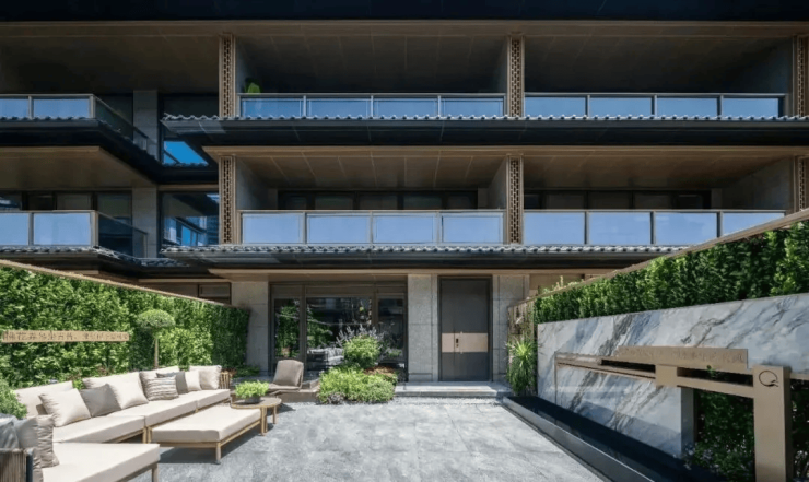 以“宋韵今形”为设计灵感,融合宋式美学与现代奢居,外立面采用伊朗进口“蓝眼睛”奢石、铝板和大面玻璃(三玻两腔工艺)。