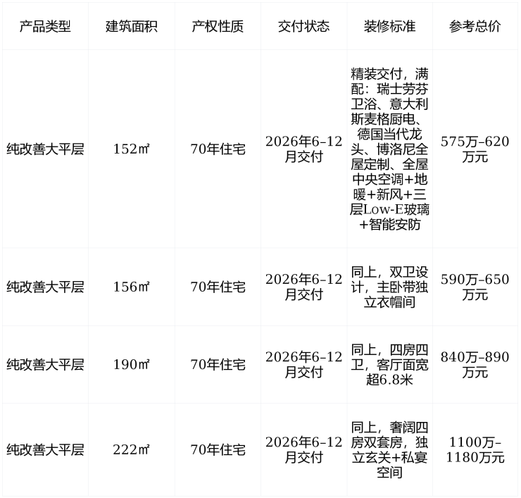 项目共11栋7–17层洋房与小高层,总户数 384席 ,主力户型建面 152㎡–222㎡四房大平层2026年6月起分批交付 ,当前 剩余房源不足60席 ,开发商已关闭线上认购,仅接受预约验房。