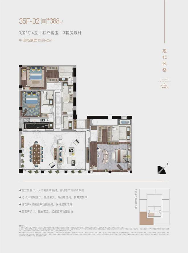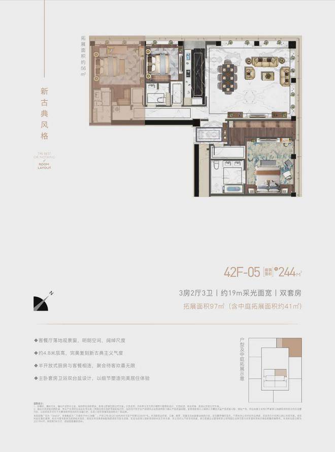 面积段:建面228-438㎡(含赠送后实际使用面积达750㎡),层高配置分为3.4米现代风与4.8米新古典风,部分房源含6.3米复式设计