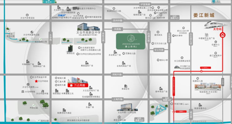 2.3公里直达太仓万达广场(含大润发超市、品牌餐饮)。