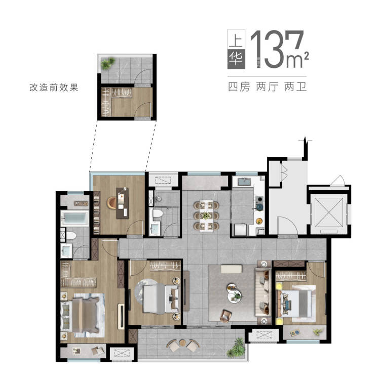 137㎡四房两卫,南北通透,主卧带飘窗,适合多代同堂;