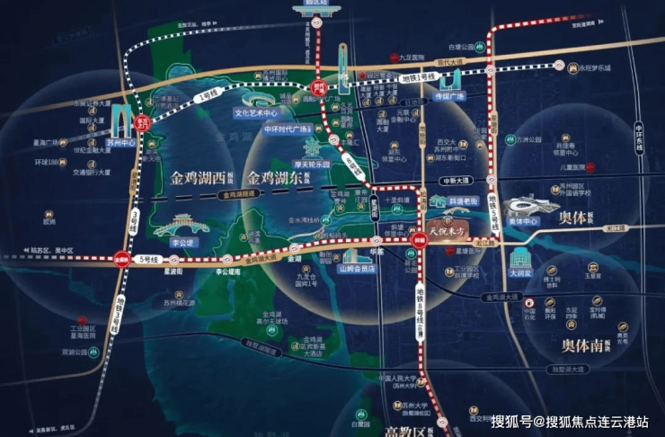 主干道路:金鸡湖大道、中新大道(含金鸡湖隧道)直达湖西商圈;星塘街、星湖街串联园区南北