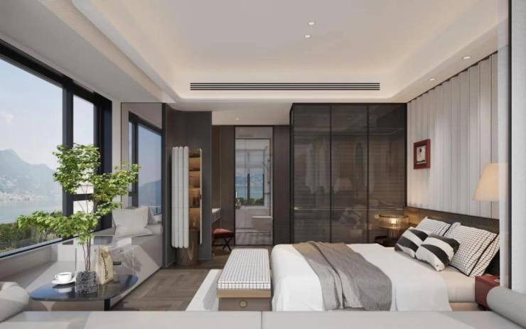 同时奢创度假酒店式双套房主卧,主卧小家化,集合睡眠、收纳、美妆、休闲榻、轻办公、迷你吧多种功能一体化,双倍的空间奢宠,可以轻易满足多孩家庭或三代同堂;主卧更创新打造了270°转角飘窗,视野与采光不与凡同。