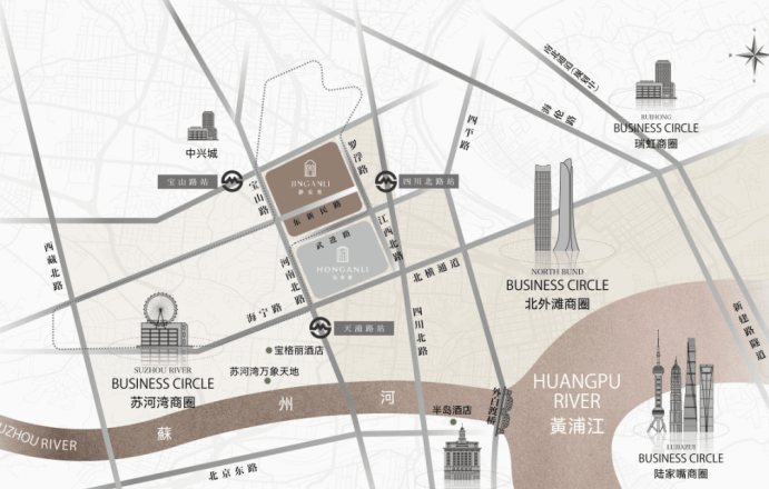 商业配套:周边有星荟中心、宝华城市广场等商业,另规划有四川北路18号街坊,作为虹口生活新地标,包含超甲级写字楼,上海约14,000㎡的文化博物馆。