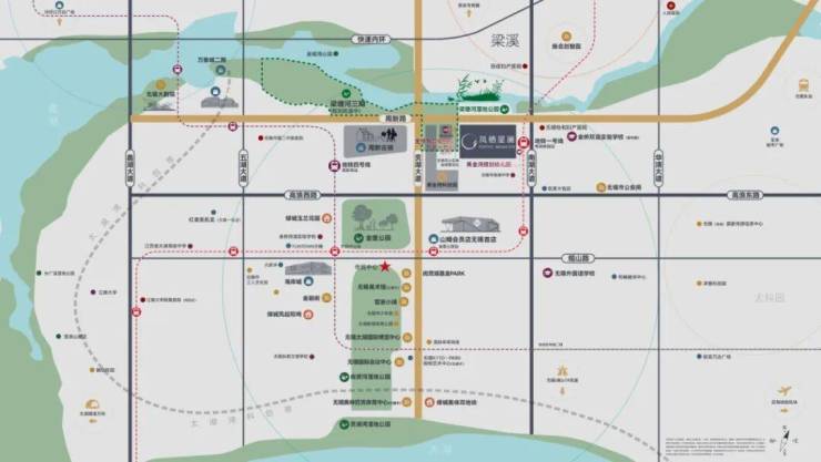 梁塘河湿地公园(北侧50米):2024年启动升级,规划48.3万方全龄主题公园,与金匮公园(南侧65万方)、蠡湖构成城市生态绿轴。
