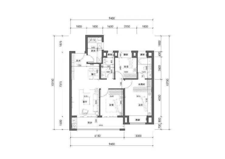 98㎡户型三房两厅两卫
