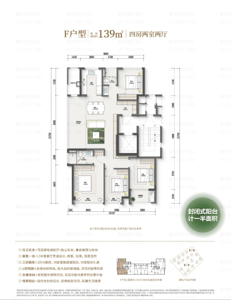 建面约128–139㎡四房:南北通透,LDKB一体化设计,餐客厅与阳台贯通,空间感强