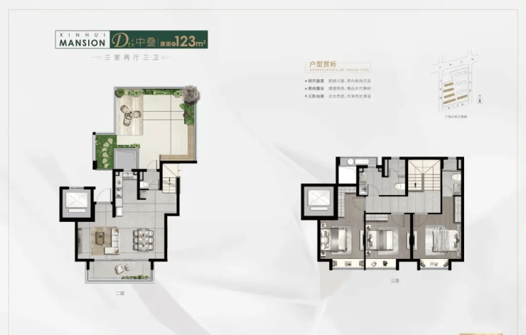 叠墅稀缺性强:上叠带星空露台,下叠享南北双庭院+5.5米挑高地下室,全套房设计,满足高端改善需求。