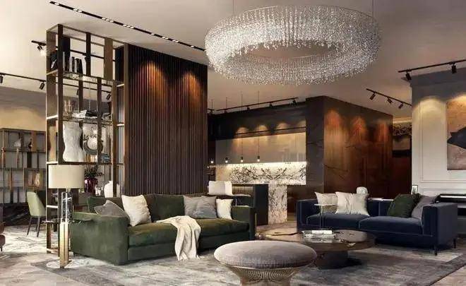客厅采用天然木制格栅装饰立柱,黄铜书架营造对称美学。意大利"B&B"品牌"Maxalto"系列奢华沙发,简约造型中透露出精致格调。艺术壁灯点缀空间,光线经墙面反射营造沉浸式氛围