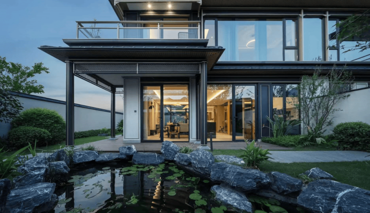 撷取宋代歇山顶、悬鱼、鱼鳞瓦等建筑元素,融合现代工艺,打造山水栖居意境
