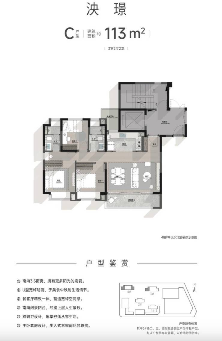 项目采用精装交付标准,包含三恒系统(恒温恒湿恒氧),层高达2.97米,部分户型采用横厅设计和四飘窗配置