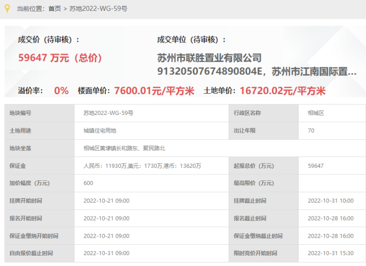 青云台,即联胜&江南国际59号地块,位于相城区黄埭镇长和路东侧、聚民路北侧,2022年10月由苏州市联胜置业有限公司&江南国际联合底价竞得!成交总价59647万元,成交楼面价7600元/㎡,溢价率0%。