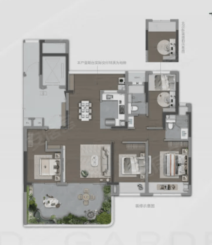 从立面图上来看,项目层高在3米,采用的是错层设计,拥有南向庭院和拐角阳台,这也是第四代住宅比较明显的特征。