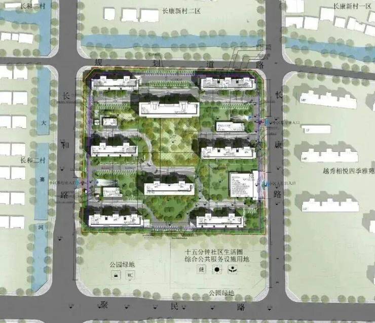 周边界面来看,也是不错的,北面是长康新村二区,东面是越秀相悦四季雅苑,南面是规划的公园绿地和十五分钟社区生活圈综合公共服务设施用地,西面则是住宅小区长和二村。
