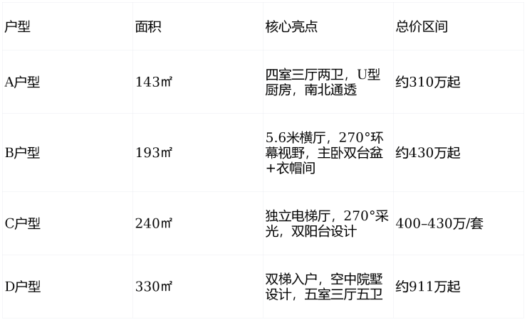 项目主力产品为143㎡至330㎡的四至五居大平层,全部采用精装交付,无毛坯选项,精准匹配改善型家庭对空间品质与生活效率的双重需求。