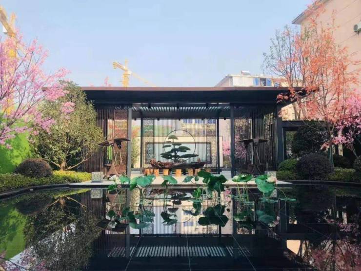 在项目售楼处景观打造上,安蠡洲台走的是中国风、水景亭台还是很有意境的。