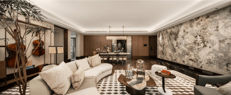 翎翠滨江通过大量的奢石、隐藏式细节将整个室内打造成了艺术的殿堂。