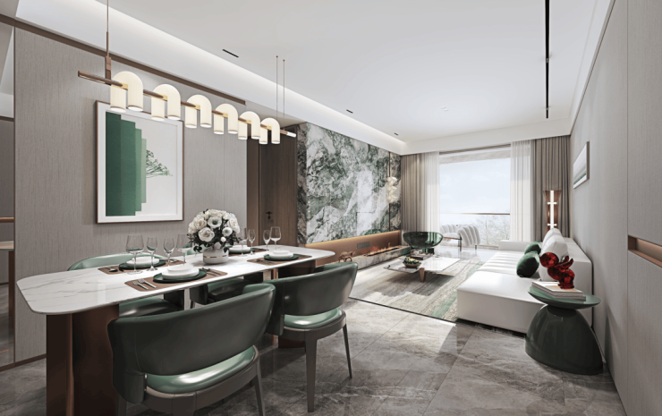 整个客厅、餐厅、厨房、阳台LDKB一体化长厅尺度就有约13.7米,整个中心空间面积做到约50㎡,一个风雅大家的“豪门”社交场就此拉开,家宴亲友聚餐开趴都能从容应对!双开间观景阳台尺度足有约6.85米,IMAX级视野,足以打开一个赏风赏景的浪漫剧场,甚至放台跑步机、瑜伽垫等,打造小小“有氧俱乐部”都可,同时也能延伸家庭聚场空间,任多元生活自在发生。