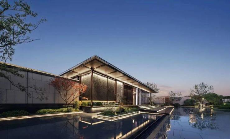 外立面采用三面铝板+香槟金飞檐,融入苏式园林元素,主入口配34米宽仪式大门及太湖石雕塑