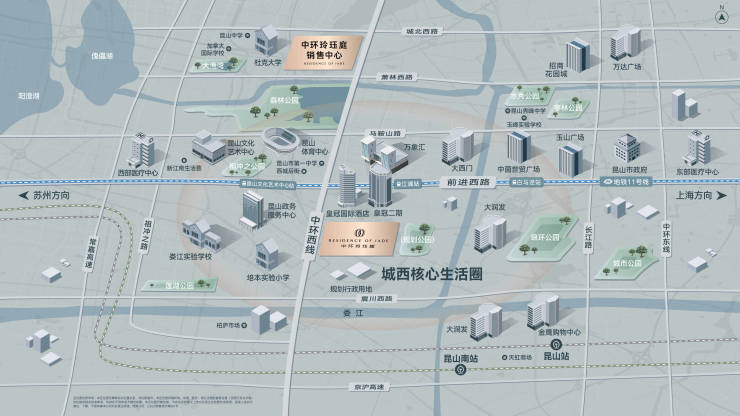 主干道路:前进西路、中环西线贯穿东西,5公里内可达昆山南站,3公里至G2京沪高速入口
