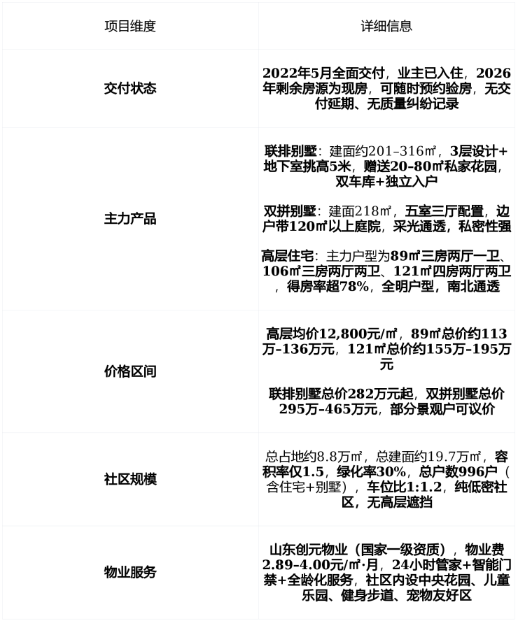 在售状态 : 2022年已竣工交付,现为尾盘现房发售 , 无期房风险 ,主力产品为 联排别墅(201–316㎡) 、 双拼别墅(218㎡) 及 高层住宅(89–121㎡) , 备案均价约12,800元/㎡ , 总价区间100万–465万元 , 剩余房源有限,仅余少量景观优选户 。
