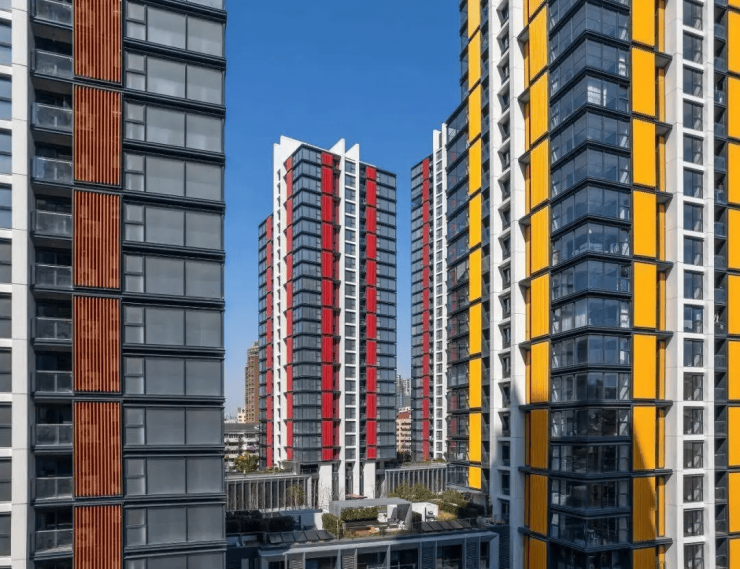 设计亮点:外立面采用大面积玻璃、铝板及纤维水泥板,阳台采用钢结构吊台承重等。