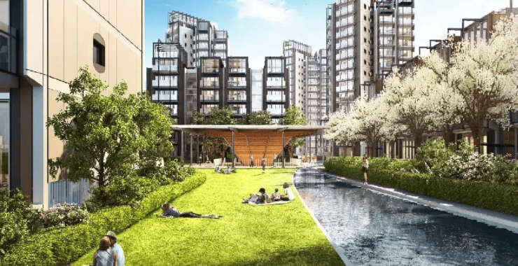 社区规划:以"一轴三园九境"为景观体系,规划有亲水平台、夜光健身跑道等功能区域。