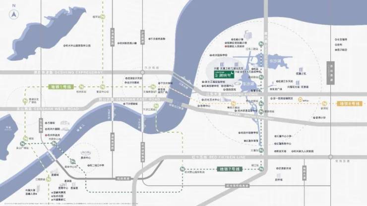 地铁7号线启成路站(已通车):项目东侧800米左右即为7号线启成路站,途径五个站点到达萧山机场、约半个小时可到达奥体、钱江新城、吴山广场等重要行政及商业区域。地铁8号线(已通车):青西三路站,无缝衔接核心区与下沙开发区,换乘1号线可通往杭州东站、武林商圈、西湖、滨江等重要区域。