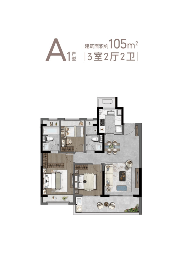 主力户型:约105㎡(3房)、128㎡(3房)、143㎡(4房)、169㎡(4房),均采用南北通透设计,三至四开间朝南,部分户型配备双联阳台、飘窗及主卧套房。