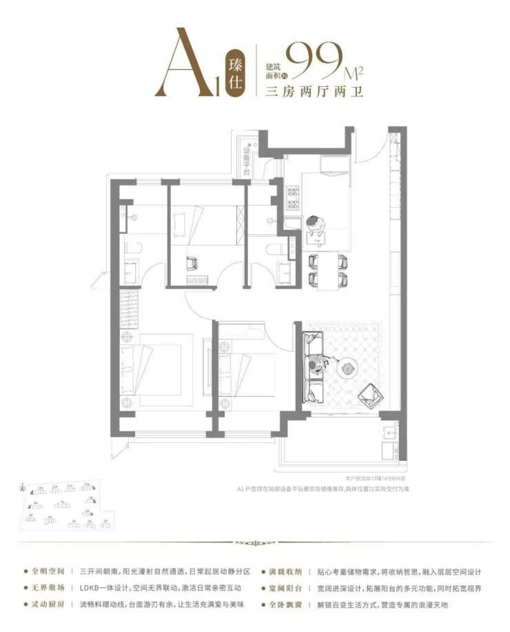 99㎡三房三开间朝南,6米横厅,全景落地窗,双阳台,无暗卫,主卧带步入式衣帽间