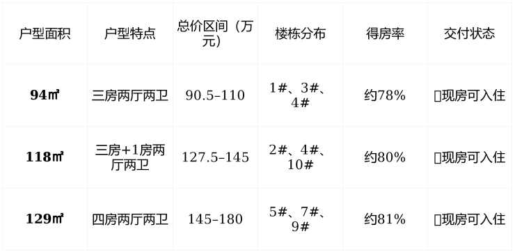 ✅ 温馨提示 :目前仍有 94–129㎡主力户型 在售, 118㎡三房+1房 最受欢迎,建议优先选 南向中高楼层 ,采光与视野最优。
