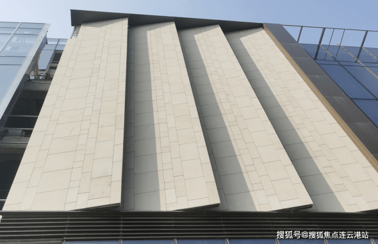 石材幕墙单榀重量平均为16.36吨,总重147.2吨,其悬挑立柱结构受力复杂,龙骨的进出位各不相同,龙骨的定位与焊接是施工难点,施工过程中对石材幕墙龙骨提出四项措施:一是整体钢架采用下托上吊方式加强,顶部增加一道连接件;二是在3层位置根据石材齿状造型增加结构飘梁,整体钢架采用下托上吊方式加强;三是主龙骨层间支座上下位置增加角钢焊接,加强支座;四是横梁位置增加连接件,采用螺栓连接,确保在横向12米横架之间起到伸缩作用。通过项目部精心组织施工,主次龙骨全部焊接完成并通过验收,符合二级焊缝的检测要求后进行石材面板安装。错缝+荔枝面黄麻石材形成一体化设计,实现建筑表皮质感及立面美学的精确控制。