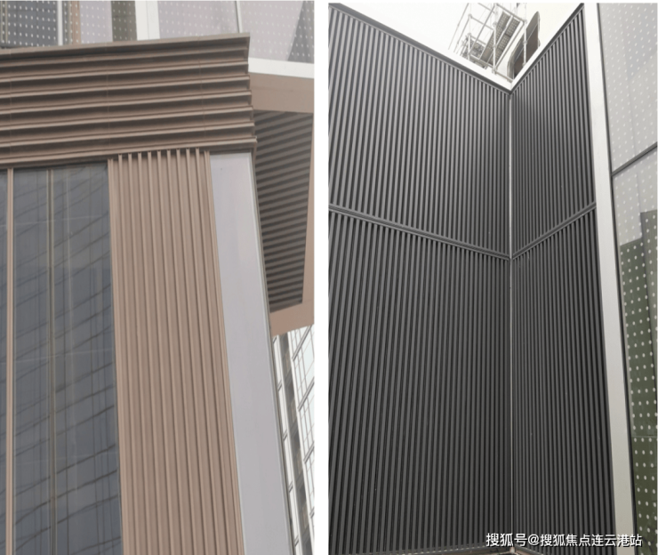 格栅作为一种活跃的建筑元素和装饰手段,设计中不但要把握好建筑外立面的整体效果,还应充分考虑室内的视觉效果及使用要求。在外立面上,建筑师通常关注建筑造型的大效果,比例尺度等;而在内立面则更重视室内的视觉感受、和通风、采光、视野、景观等需求。经过设计建筑室外格栅能与建筑融为一体,不但能满足基本功能需求,还能创造出独特的建筑艺术造型及室内光影、空间效果。裙楼凹槽位、吊顶、屋面、通风井位置采用铝合金型材方管,通过连接件、螺栓等配件组成框或与建筑物主体结构之间连接固定,格栅横龙骨与竖龙骨之间通过螺钉或螺栓连接,形成一个铰接结构体系,从完工效果来看,整体搭配线条流畅,视觉美观,展现了施工团队的精准把控实力,突出表现格栅的灵动性。