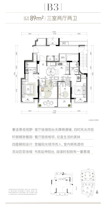 市场爆款建筑面积约89m²神户型,四开间朝南、约11.5米南向面宽、约18.5m²豪华主卧,三室两厅两卫格局,91%高得房率,舒适度堪比100方空间。