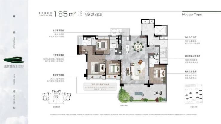 蠡棠森屿所有户型露台挑高可达6m,突破了高度限制,成就了墅级的挑高厅。很多户型拥有南北及270°转角露台,创新曲面转角院落,并实现全户型搭载“客厅/卧室-空中庭院”的主动线设计,整体营造立体墅式庭院生活场景。