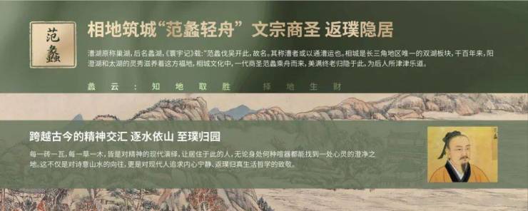 项目位于苏州相城区,地处长三角地区唯一双湖板块。在相城文化中,一代商圣范蠡乘舟而来,美满终老归隐于此。基于相城深厚的在地文化,旭辉建管提取“范蠡泛舟”融入自然语境中,以跨越古今的精神交汇,以现代化的手法演绎,不仅表达了对诗意山水的向往,更是对现代人追求内心宁静、返璞归真生活哲学的回应。