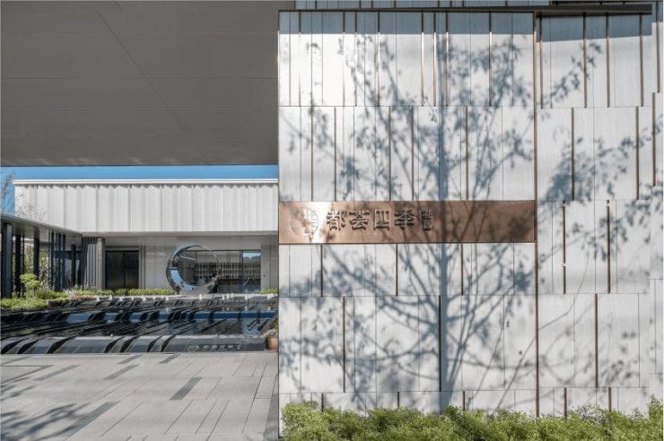 建筑风格现代简约,玻璃幕墙+横向线条,视觉通透,耐看耐住