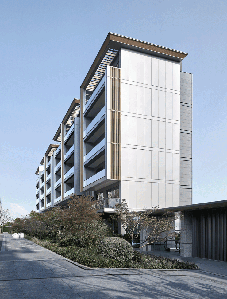 新中式灰墙黛瓦立面,融合全景玻璃幕墙,坡地台地式布局