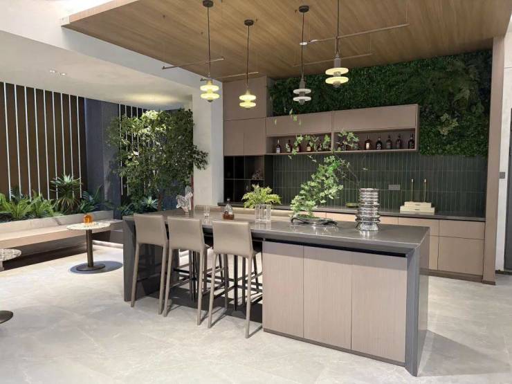 一栋是以中央共享餐吧为主题的架空层,岛台旁布置了吧台、休闲座椅等,十分适合与朋友、邻居开个派对或是举办烘焙沙龙。暖黄的灯光与绿植搭配,温馨又不失格调。